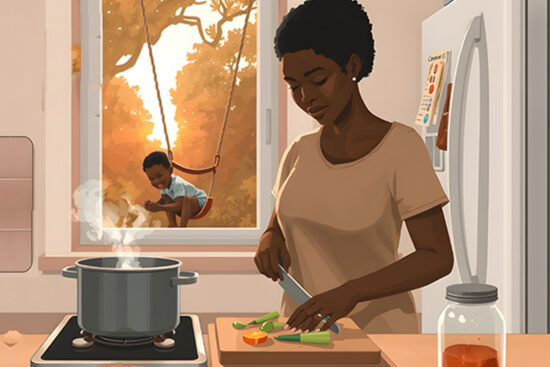 “Your Father knows what you need before you ask him.”— Matthew 6:8 — A tired mum chops vegetables while her…