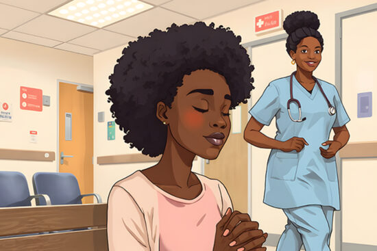 A woman sits in a hospital waiting room, her hands shaking as she waits for news about a loved one.…