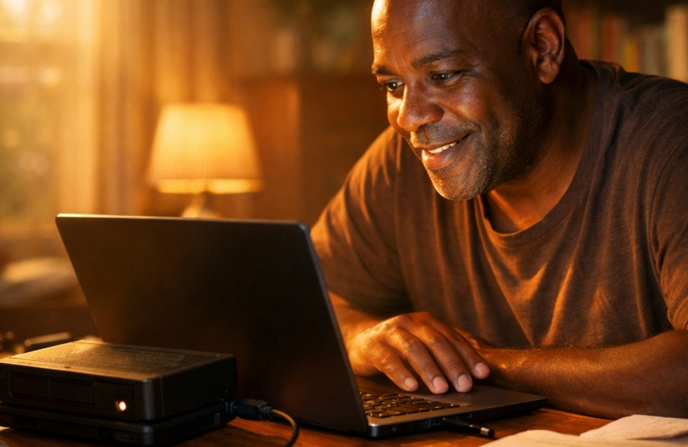 A man carefully backed up all his important files on an old device he had trusted for years. One day, the device suddenly failed, and everything seemed lost. Later, he discovered that his data had already been synced to a secure cloud system. What he thought was gone had actually been preserved all along.