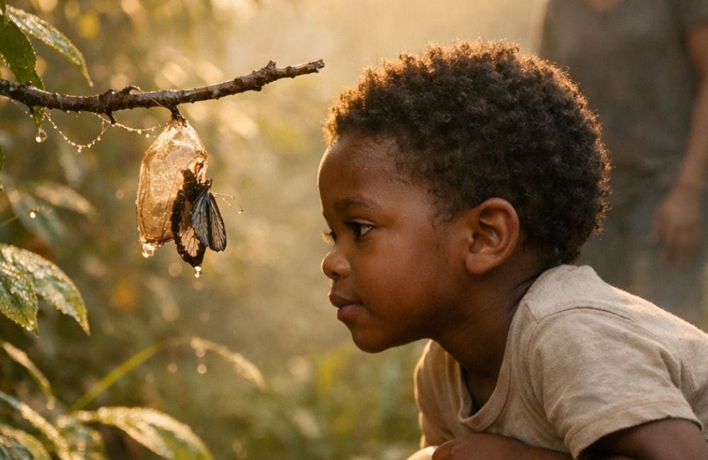 A caterpillar stays hidden in a cocoon for weeks, still and unseen. A child watching assumes it is gone forever. Then one morning, the shell opens. Something fragile emerges. Hours later, wings unfold and lift. What seemed like an ending was a beginning.